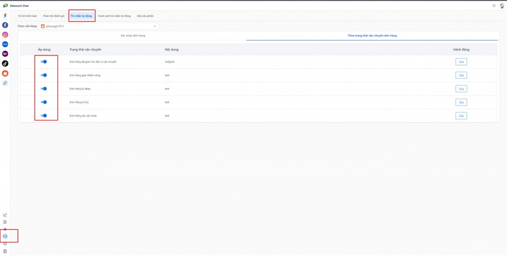 – Bước 3: Truy cập vào link: https://chat.home.salework.co/chatBot chọn các shop của sàn shopee để bật toàn bộ các nút kích hoạt tin nhắn tự động như hướng dẫn dưới ảnh.