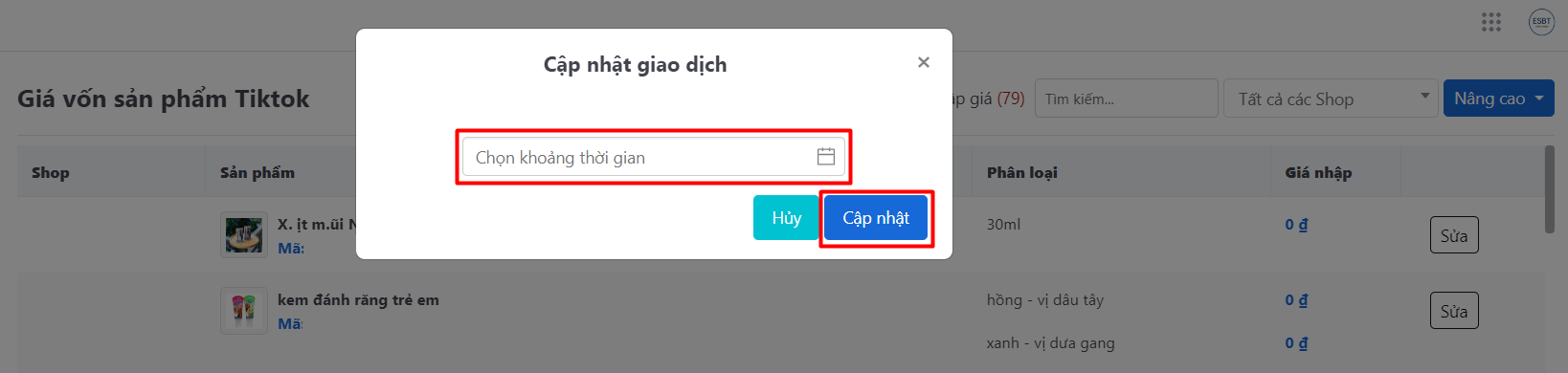 Bước 2: Lựa chọn thời gian muốn cập nhật giao dịch rồi click Cập nhật