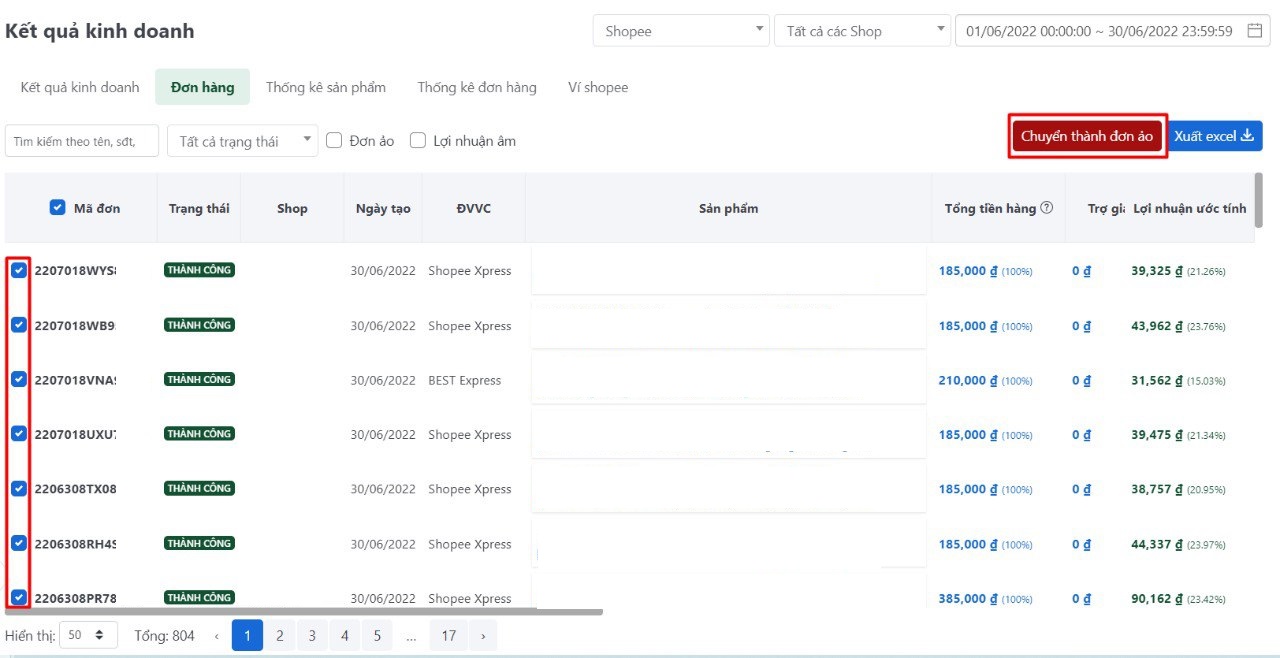 Cho phép người dùng chuyển đơn hàng thành đơn ảo nhanh chóng và dễ dàng hơn. Thống kê phí sàn và phí vận chuyển dự kiến cho các đơn hàng đã chuyển thành đơn ảo sau đó người dùng có thể tạo  chi phí khác cho các khoản chi phí cho việc book đơn ảo.