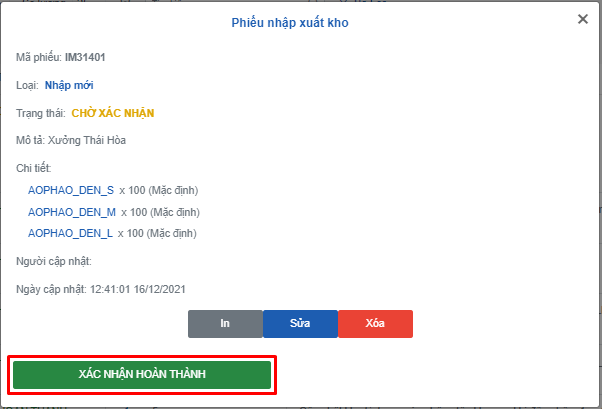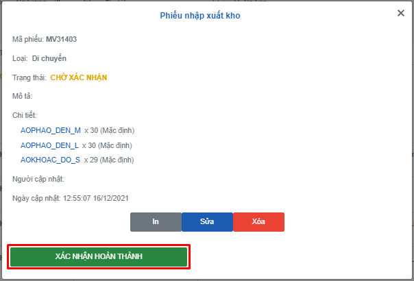 Bước 3: Bấm Xác nhận hoàn thành phiếu để hoàn tất việc di chuyển sản phẩm