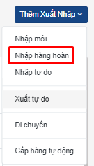 Tại mục Xuất nhập kho chọn Thêm xuất nhập, nhấp chuột vào Nhập hàng hoàn.