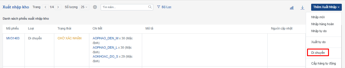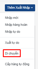 Bước1: Tại mục Xuất nhập kho chọn Thêm xuất nhập, nhấp chuột vào Di Chuyển
