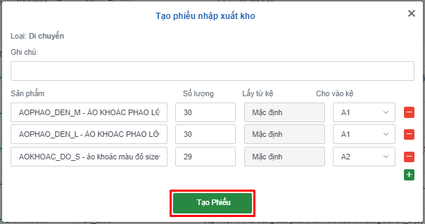 Nhập thông tin các sản phẩm và vị trí kệ hàng cần chuyển sản phẩm đến, sau đó bấm Tạo phiếu
