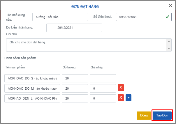 Bước 2: Nhập đầy đủ thông tin đơn hàng và bấm Tạo đơn
