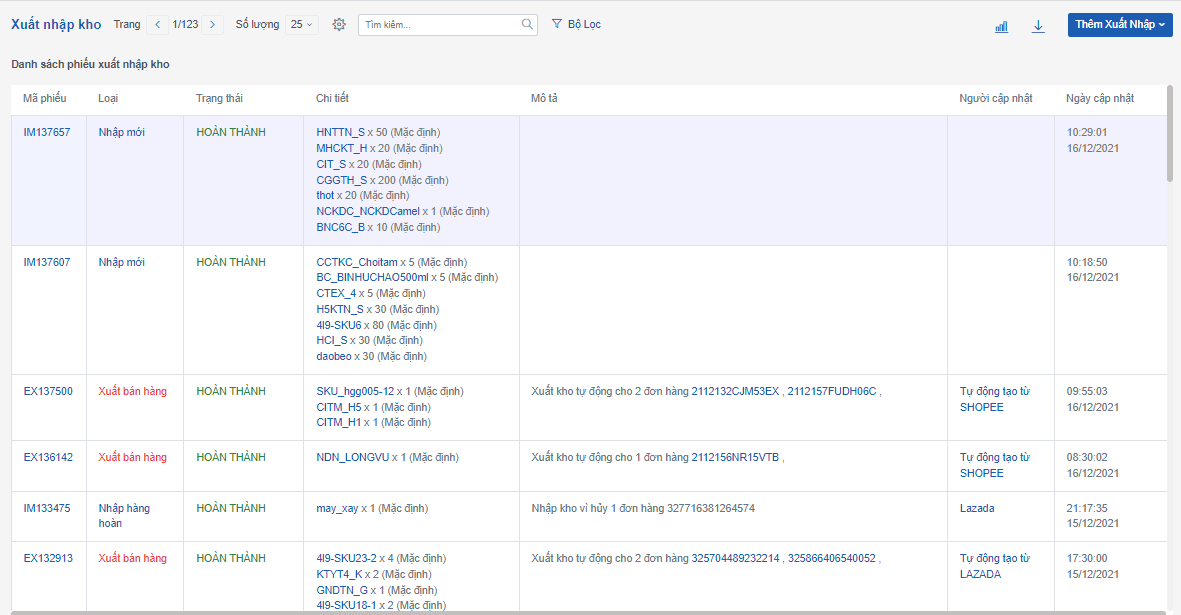 – Trạng thái: Trạng thái của phiếu nhập – xuất là hoàn thành hay chờ xác nhận