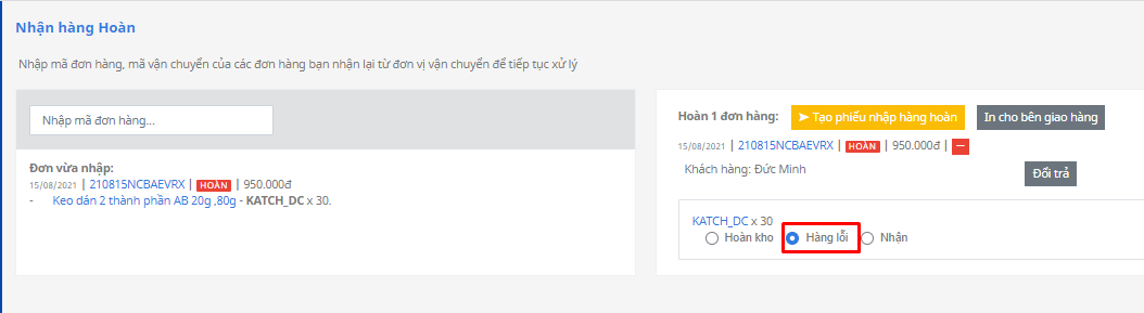 Quản lý tất cả các sản phẩm trong đơn hàng hoàn về bị lỗi, hỏng hóc không còn sử dụng được nữa. Khi tạo phiếu nhập hàng hoàn nếu sản phẩm bị lỗi không còn sử dụng được tích chọn sản phẩm đó là Hàng lỗi để không cộng lại vào tồn kho.