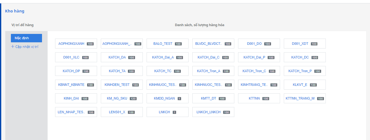 Sau khi đã thêm hết tên các kệ hàng, bạn bấm Cập nhật để hoàn tất việc tạo kệ hàng.