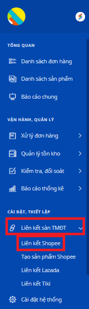 Bước 2: Chọn tab Liên kết Sàn TMĐT/ Liên kết Shopee/lazada/Tiki ở thanh menu bên trái màn hình.