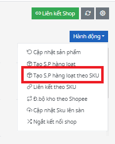Bước 3: Click vào ô Hành động ở góc phải bên trên màn hình, sau đó chọn Tạo sản phẩm hàng loạt theo SKU.