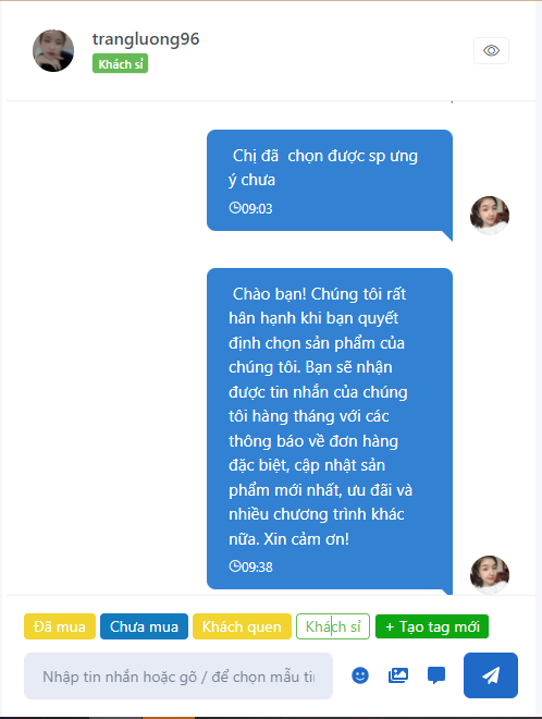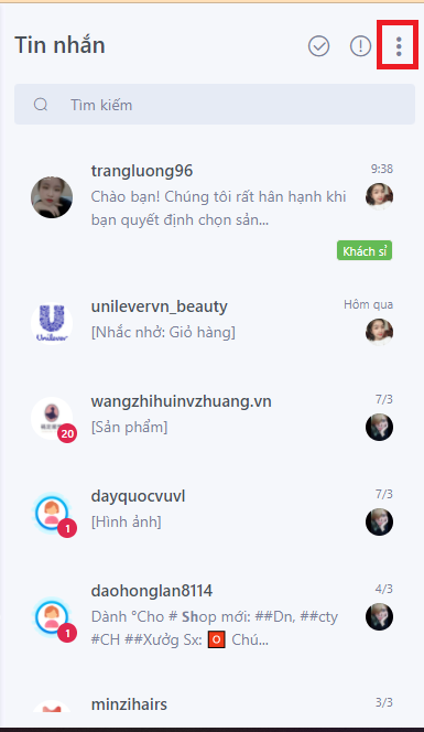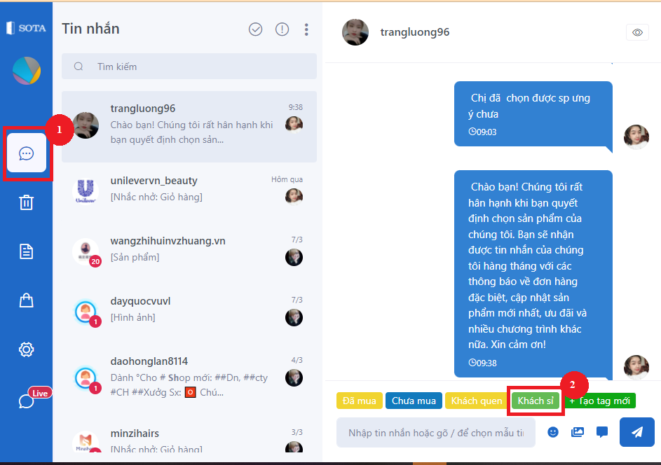 Bước 4: Để cài đặt tag cho đoạn chat, bạn hãy chọn biểu tượng để truy cập Danh sách tin nhắn. Sau khi lựa chọn đoạn chat, bạn chọn các tag đã được cài đặt sẵn ở giao điện chat.