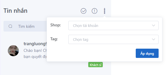 Bước 6: Sau khi chọn Shop và Tag, click vào ô Áp dụng. Tất cả các đoạn chat phù hợp với điều kiện bạn đã chọn sẽ hiện lên tại màn hình chat.