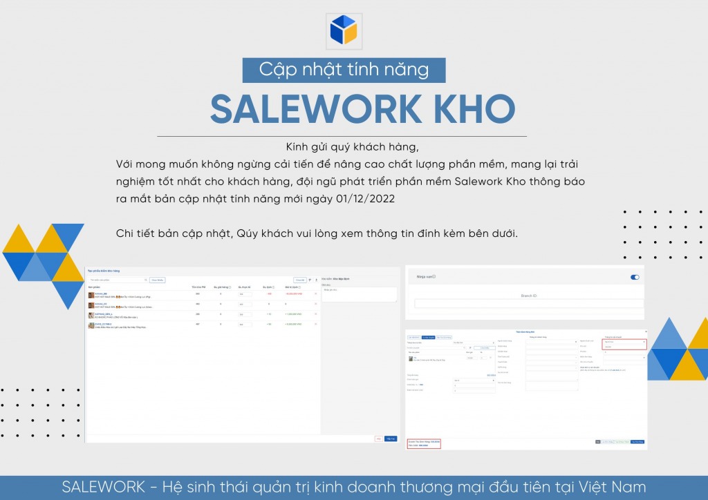 Nhằm nâng cao trải nghiệm của quý khách hàng, đội ngũ thông báo ra mắt bản cập nhật mới của ứng dụng Salework Kho. Ở bản nâng cấp phần mềm ngày 30/12/2022, chúng tôi đã tối ưu lại giao diện và đưa thêm các tính năng mới như sau: