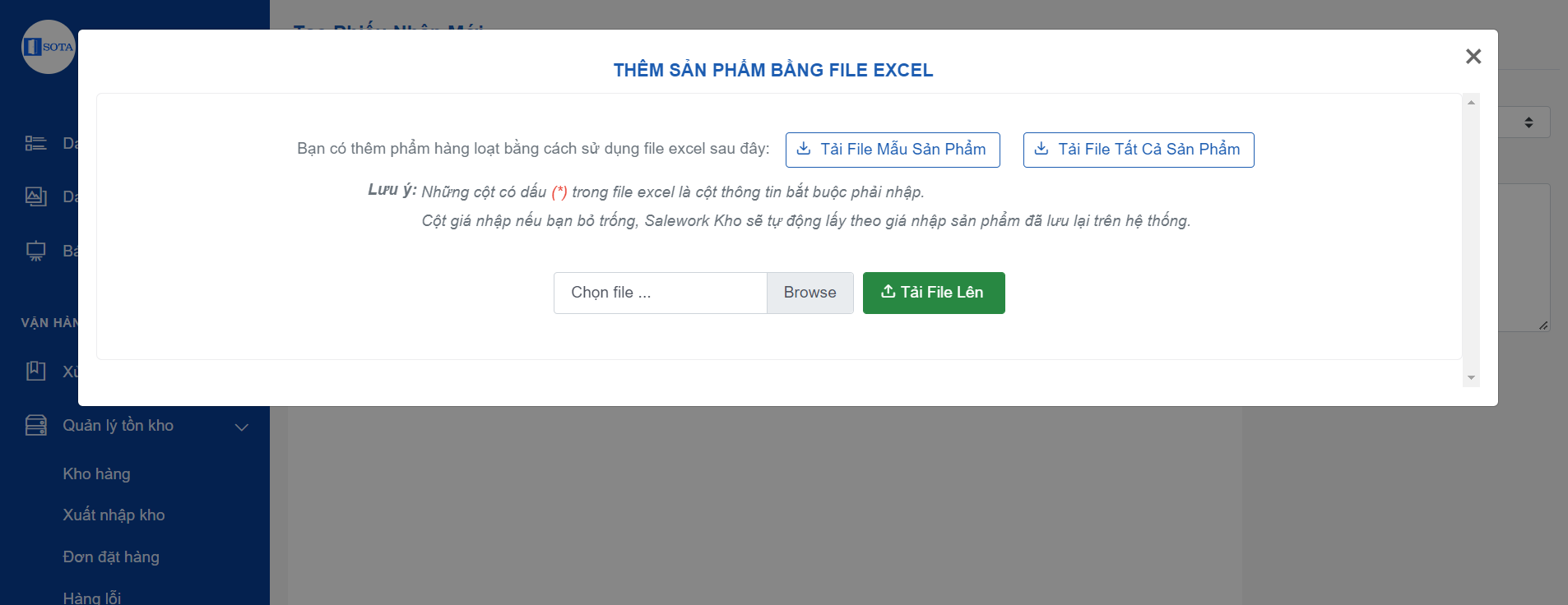 Tải file mẫu sản phẩm: File tải xuống sẽ là file trống, bạn sẽ cần phải điền thông tin sản phẩm, tồn kho bạn muốn nhập vào file này.