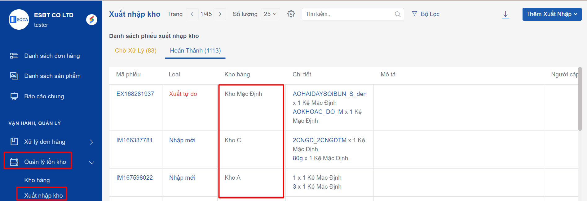 1.4 Bổ sung thêm cột Kho hàng trong giao diện Xuất nhập kho